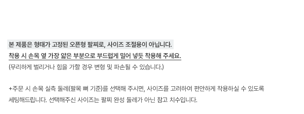 +주문 시 손목 실측 둘레(팔목 뼈 기준)를 선택해 주시면, 사이즈를 고려하여 편안하게 착용하실 수 있도록 세팅해드립니다. 선택해주신 사이즈는 팔찌 완성 둘레가 아닌 참고 치수입니다.