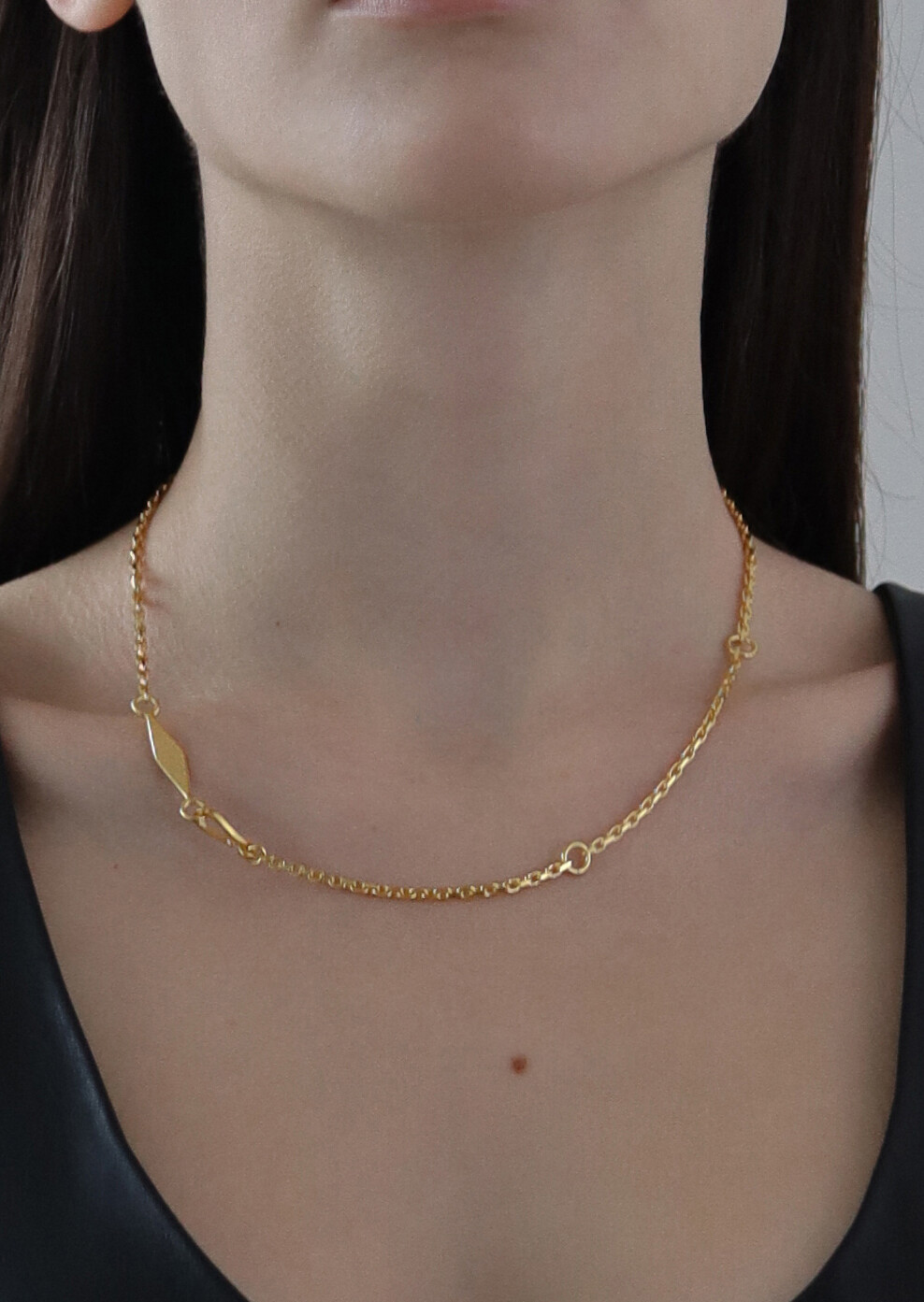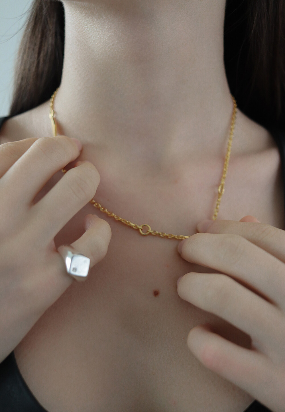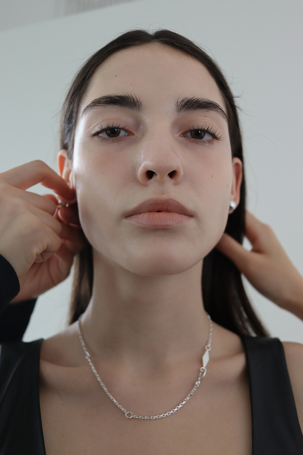 체인에 자잘한 각이 있어 중성적인 느낌을 줍니다. 느슨한 길이로 편안한 니트나 티셔츠에도 무난하게 잘 어우러집니다.